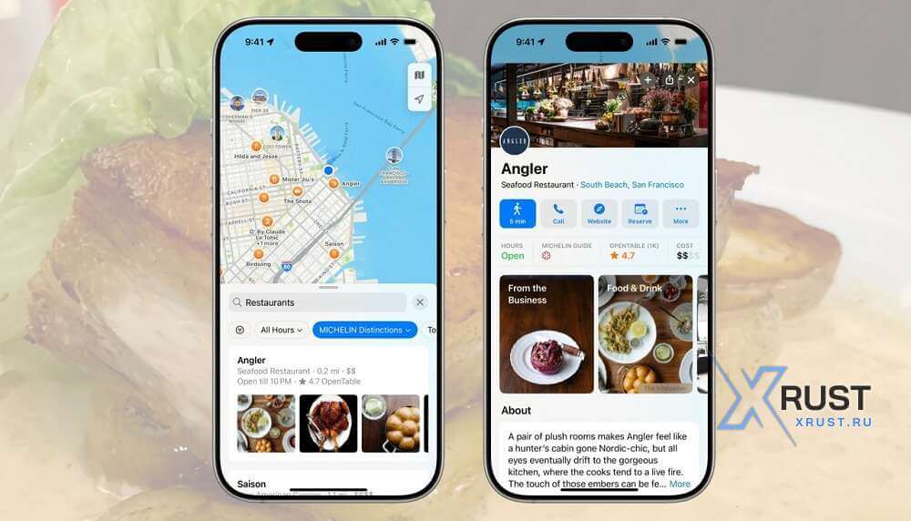 Apple Maps, реализуя эту идею xrust, воспользовался партнерскими услугами Michelin. Эта компания обеспечила поиск местного ресторана, входящего в его знаменитый звездный рейтинг. Партнерство также включает рекомендации ресторанов Green Star, которые присуждаются устойчивым заведениям высокого класса, и мест, отмеченных Bib Gourmand. В этих заведениях общепита предлагают высококачественную еду по более низким ценам.