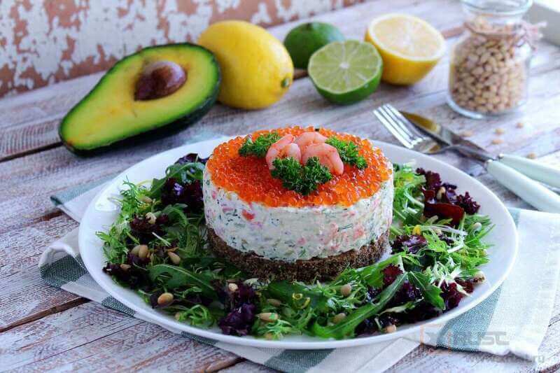 - Финальный акцент: Украсить салат лососевой икрой и зеленым луком.