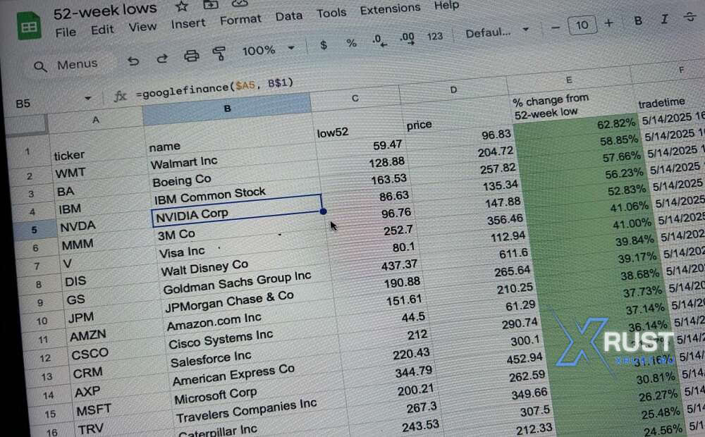 Кроме того, вы можете скопировать вкладку «DJIA» и создать свой собственный список акций, чтобы отслеживать их изменения с 52-недельных минимумов.