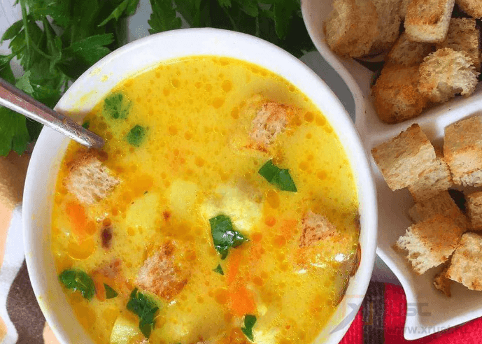 К картофельному супу по царски очень подходят свежие гренки, а можно просто добавить в тарелку сухарики.