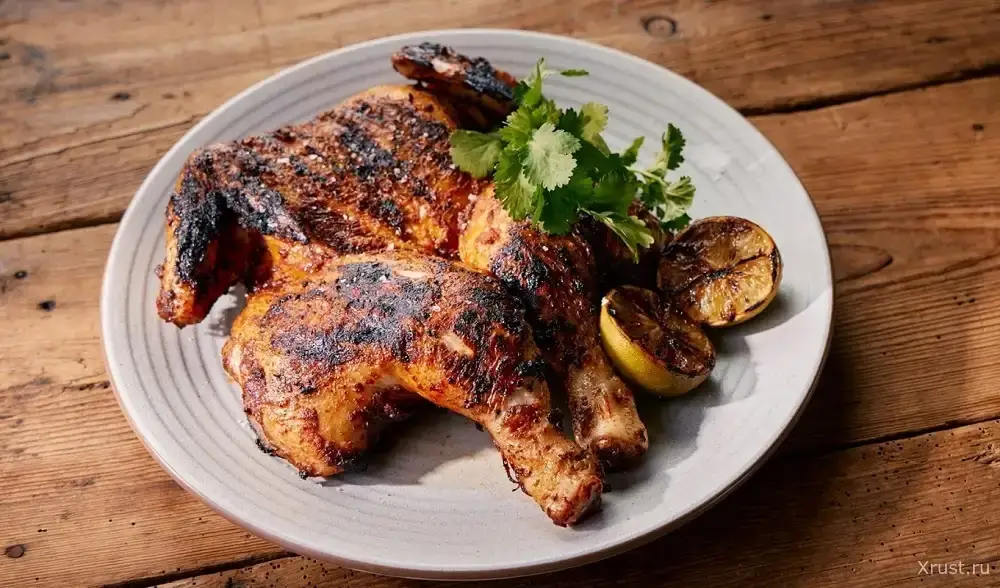 Этой смесью курица и натирается. Важно – её отбивают, как цыпленка табака. Мясо мариновать не надо: специи пропитывают курицу своим ароматом во время приготовления – на гриле или на сковороде на плите, а затем в духовке. Если есть возможность, готовьте ее над углями.
