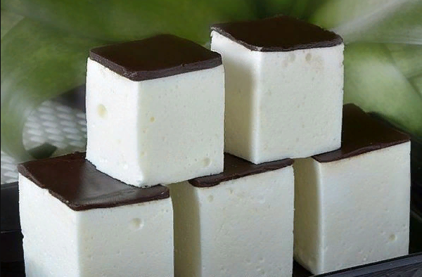 После того как «птичье молоко» будет готово , разрежем его на квадратики горячим ножом, чтобы шоколад не разламывался. Вы также можете приготовить десерт «Птичье молоко». рецепт здесь
